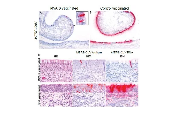 中東呼吸綜合征冠狀病毒(MERS-CoV)是又一種近年來高致病性的冠狀病毒。在對該病毒疫苗的研發過程中,Haaqmans BL 研究團隊通過 RNAscope 技術檢測了注射疫苗的效果,發現駱駝鼻粘膜內,病毒顆粒在疫苗注射組相較于對照組有顯著下調(見下圖,RNAscope 陽性信號為 A 圖,B 圖和 C 圖中 ISH 中的紅色信號點)[3]。