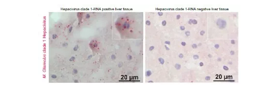 在病毒感染動物模型的建立和驗證中,Drexler JF 團隊通過 RNAscope 的方法,檢測小鼠肝細胞內 HCV 病毒的存在和分布狀況,確認 HCV 病毒感染動物模型建立成功(下圖中的紅色信號點)[4]。