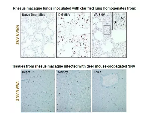 相同的 RNAscope 應用實例也被報道在漢他病毒(Sin Nombre/Hantavirus,SNV)感染病毒動物模型中。RNAscope 結果確認漢塔病毒存在于恒河猴肺臟上皮細胞內(下圖中棕色信號點)[5]。