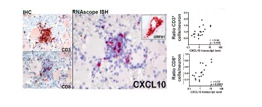RNAscope 檢測結果顯示感染過 SVV 之后,伴隨著 CD8 陽性 T 細胞的聚集,同一區域表達 CXCL10 細胞趨化因子,提示 T 細胞的聚集是由 CXCL10 因子誘導引發的[4]。