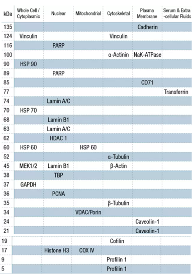 Actin,一種廣泛表達(dá)的真核蛋白,是細(xì)胞骨架的重要組分。研究證明在原始乳腺癌細(xì)胞中Actin是高度磷酸化的(9)。研究也發(fā)現(xiàn)凋亡條件下體外和心臟肌肉以及骨骼肌中都能觀察到Actin的清除(10),因此,不適用于骨骼肌的樣品。Caspase-3對(duì)Actin的清除會(huì)加速泛素/蛋白酶體依賴的肌肉蛋白酶解(11)。 細(xì)胞生長(zhǎng)條件的改變以及與胞外基質(zhì)組分的相互作用都可能會(huì)導(dǎo)致Actin蛋白合成的變化 。