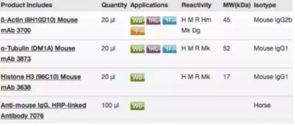 內(nèi)參蛋白主要是一些持家基因,這些持家基因執(zhí)行大量的基本功能,并持續(xù)在多種組織和細(xì)胞中高水平表達(dá)。 常見內(nèi)參蛋白包括Actin、Tubulin、GAPDH、Histone H3等。但是,研究不同類型的蛋白,對(duì)內(nèi)參的選擇是有講究的,如1)胞漿蛋白的內(nèi)參與胞核蛋白的內(nèi)參是不一樣的;2)在一定的實(shí)驗(yàn)條件下,內(nèi)參蛋白的表達(dá)發(fā)生明顯的變化時(shí)需要選擇其他表達(dá)不變或者變化很小的蛋白;3)當(dāng)研究的蛋白的分子量與內(nèi)參接近時(shí),需要選擇分子量與目的蛋白的分子量差距比較大的蛋白等。