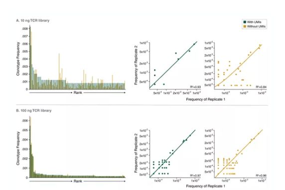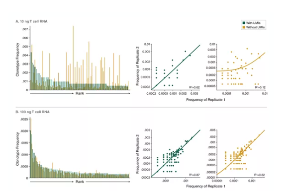 使用唯一分子標簽序列(UMI)實現克隆型的精準檢測。在有或沒有 UMI 情況下,比較小鼠 TCR 克隆型頻率。根據有 UMI 的測序結果,對前 100 個高表達克隆型進行排序。在有或沒有 UMI 情況下,重復建庫,克隆型頻率重疊繪制于圖中。每個條形或圓點代表一個克隆,該克隆經過總讀長分析或使用 UMI 過濾。使用 UMI 可對原始樣本中的起始 RNA 分子進行絕對定量。當將克隆按照富集度從高到底進行排序,沒有 UMI 的數據會導致 PCR 或測序擴增的偏差,從而誤導樣本中克隆型頻率的分析。UMI 的使用通過對起始樣本中 RNA 的絕對定量來校正偏差。使用 UMI 也可以在重復本之間實現更好的相關性,尤其是起始量較低時。各個文庫向下抽樣 500,000 reads。