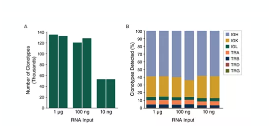 使用 NEBNext 免疫測序試劑盒(人),能夠在同一管中制備人 BCR 和 TCR 文庫。分別使用 1 μg、100 ng 和 10 ng 人 PBMC 總 RNA(Takara Bio #636592)制備人 BCR+TCR 文庫,每個起始量都做有平行實驗。所有文庫向下抽樣 950,000 reads。使用 pRESTO 工具完成 reads 過濾、序列組裝和基于 UMIs 組成共有序列。使用 MiGMAP 鑒別 V、D 和 J 區域。圖(A)表示每個人類 PBMC 總 RNA 起始樣本檢測到的克隆型數量。圖(B)表示各文庫中 B 細胞鏈和 T 細胞鏈所占百分比。