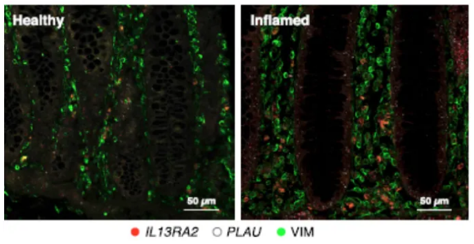 盡管大多數成纖維細胞亞群同時存在于健康個體和UC患者中,但一類稱之為炎癥相關成纖維細胞(IAFs)的亞群在一些病人的炎癥組織中表達擴大了189倍。IAFs富含許多與結腸炎、纖維化和癌癥相關的基因,包括IL11、IL24和IL13RA2。研究人員就利用RNAscope原位雜交技術檢測了健康組織與炎癥組織中的炎癥相關成纖維細胞的特征基因表達,證實了表達IL13RA2的炎癥相關成纖維細胞在炎癥組織中的表達遠高于正常組織(見下圖,紅色為RNAscope檢測到的IL13RA2的RNA信號)。