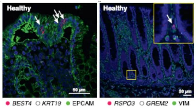 2019年來自麻省理工學院和哈佛大學的研究學者在《Cell》雜志上發表的一篇研究論文揭示了潰瘍性結腸炎的耐藥機制[1]。在這項研究中,研究人員利用scRNA-seq從18例潰瘍性結腸炎(UC)患者和12例健康人的結腸粘膜中生成了366,650個細胞的圖譜,以此來了解細胞類型特異性和作用途徑,揭示了51個上皮細胞、基質細胞和免疫細胞亞群。在UC患者中,腫瘤壞死因子(TNF)蛋白水平較高,抗TNF藥物可減輕炎癥并治愈許多患者的組織。然而,大約30%的患者對治療沒有響應,而那些有響應的患者隨著時間的推移變得具有耐藥性。研究人員此前已經確定了耐藥性相關的基因,但尚不清楚結腸中哪些特定的細胞類型表達了這些基因。在此次研究中,單細胞測序數據分析表明BEST4 +腸上皮細胞,RSPO3+成纖維細胞,IL13RA2 + IL11 +炎性成纖維細胞等細胞亞群與抗腫瘤壞死因子(TNF)治療的抗性有關。研究人員進一步利用RNAscope原位雜交結合免疫熒光驗證并從空間定位上展現了單細胞測序的主要發現。下圖為使用RNAscope檢測到的健康人BEST4 +腸上皮細胞(左圖,紅色表示RNAscope檢測到的BEST4的RNA信號)與RSPO3+成纖維細胞(右圖,紅色表示RNAscope檢測到的RSPO3的RNA信號)在腸道中的定位情況。