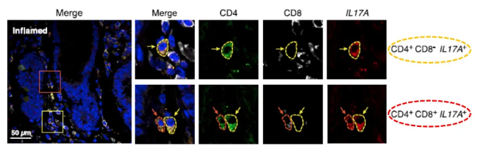 除了炎癥相關成纖維細胞外,單細胞測序分析結果也表明在UC患者樣本中,同時表達CD8和IL-17的T細胞所占比例更高。在進一步的RNAscope原位雜交驗證中發現CD4+與CD4- T細胞都共表達CD8與IL17A(見下圖,紅色為RNAscope檢測到的IL17A的RNA信號)。其中CD4+ CD8+IL17A+ T細胞是一類新發現的細胞亞群,在炎癥組織中,CD4+ CD8+IL17A+ T細胞的數量明顯增加。