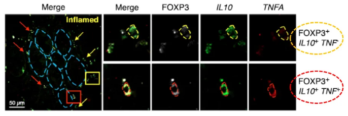 腫瘤壞死因子(TNF)的表達在UC患者中發生改變,Treg細胞從健康組織向炎癥組織擴展,是炎癥過程中TNF的主要來源。在炎癥組織中,TNF在Treg細胞中誘導表達。研究人員利用RNAscope原位雜交檢測了IL10,TNFA以及Treg細胞標志基因FOXP3的表達,驗證了在炎癥組織中Treg細胞中TNF的表達顯著上升(見下圖,白色為RNAscope檢測到的FOXP3的RNA信號,綠色為RNAscope檢測到的IL10的RNA信號,紅色為RNAscope檢測到的TNFA的RNA信號)。