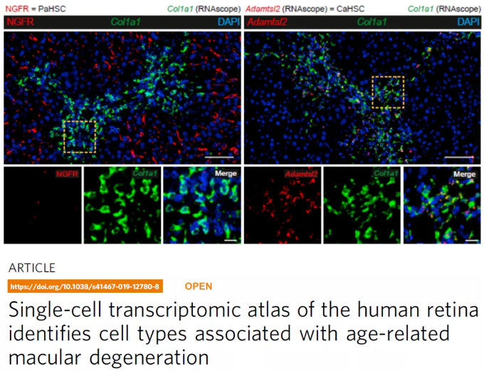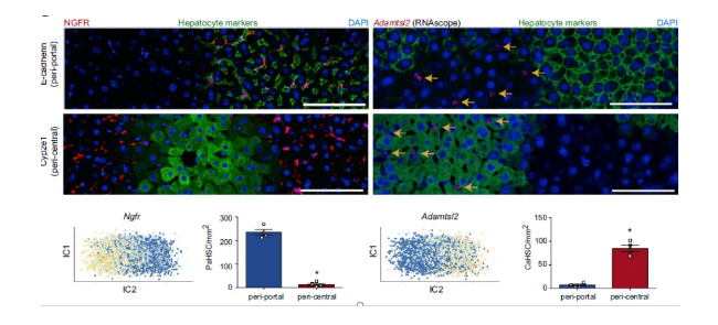 急性CCL4誘導的肝損傷的特征是HSCs顯著增值以及被激活為肝小葉中心區域產生膠原的肌成纖維細胞。為了進一步研究PaHSCs和CaHSCs分化為致病性膠原產生細胞的動態,研究人員利用單細胞測序分析了急性CCL4誘導的肝損傷小鼠模型的HSCs。結果表明PaHSCs和CaHSCs兩個細胞亞群均表達細胞增殖標志物ki67,而只有CaHSCs中纖維化相關的基因表達顯著升高。利用RNAscope原位雜交結合免疫熒光證實了CaHSCs是在肝小葉中心性損傷導致的纖維化過程中產生病原膠質的主要細胞(見下圖,左圖紅色為RNAscope檢測到的NGFR的RNA信號,右圖紅色為RNAscope檢測到的Adamtsl2的RNA信號)。