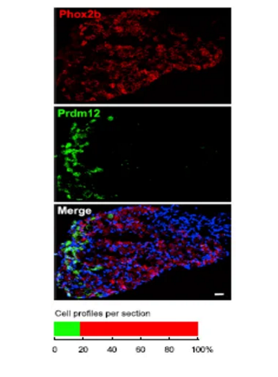 迷走神經感覺神經元是控制器官功能所必需的,但目前對所涉及的神經元類型的復雜性仍缺乏了解。2019年來自瑞典卡羅林斯卡研究所的研究人員通過scRNA-seq對頸靜脈和結節性迷走神經節的神經元類型進行了全面的鑒定和分類,鑒定出6種頸靜脈神經元和18種節狀神經元[4]。小鼠迷走神經神經節復合體包括神經嵴衍生的頸靜脈神經節和基板來源的節狀神經節,轉錄因子Phox2b可作為節狀神經元的標志物,另一種轉錄因子Prdm12可作為頸靜脈神經元的標志物。在此研究中,單細胞測序鑒定的24個迷走神經節神經元細胞群中有18個表達Phox2b,其余6個表達Prdm12。研究人員使用RNAscope技術進一步地量化分析了分別表達Phox2b與Prdm12的神經元的相對比例(見下圖,紅色為RNAscope檢測到的Phox2b的RNA信號,綠色為RNAscope檢測到的Prdm12的RNA信號),結果表明在469個神經元中,386個表達Phox2b,83個表達Prdm12。與單細胞測序結果一致,表明迷走神經神經節復合體由約85%的節狀神經元與約15%的頸靜脈神經元組成。