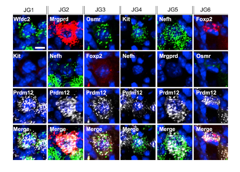 scRNA-seq鑒定的6種頸靜脈神經元分別命名為JG1-JG6。6種頸靜脈神經元分別有相應的特異性表達基因,JG1為Wfdc2,JG2為Mrgprd,JG3為Osmr,JG4為Kit,JG5為Nefh,JG6為Foxp2。為了證實這6種頸靜脈神經元在體內的分布,研究人員用RNAscope多重熒光原位雜交進行了驗證,針對不同的神經元亞群,分別設計了兩種探針,一種是每個神經元亞群對應的特異性表達基因,一種是頸靜脈神經元標志基因Prdm12,兩種探針聯合使用,原位鑒定6種不同的頸靜脈神經元(見下圖,RNAscope檢測到的Wfdc2,Osmr,Kit,Nefh的RNA信號為綠色,RNAscope檢測到的Mrgprd,Foxp2的RNA信號為紅色,白色為RNAscope檢測到的Prdm12的RNA信號)。