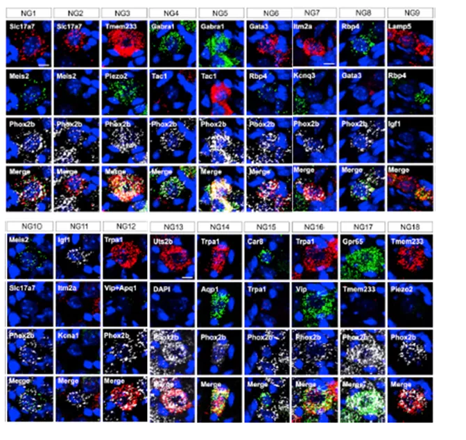 scRNA-seq鑒定的18種節狀神經元分別命名為NG1-NG18,所有節狀神經元類型都有獨特的基因表達模式。研究人員用RNAscope原位雜交的方法檢測18種節狀神經元的特征基因以及所有節狀神經元的共同標志基因Phox2b的表達,從空間定位上鑒定了18種不同的節狀神經元類型(見下圖,白色為RNAscope檢測到的Phox2b的RNA信號,綠色和紅色分別為RNAscope檢測到的18種節狀神經元的特征基因的RNA信號)。從而對測序結果進行了細胞和原位空間分布的驗證。