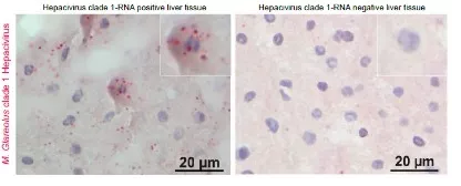 在病毒感染動物模型的建立和驗證中,Drexler JF 團隊通過 RNAscope 的方法,檢測小鼠肝細胞內 HCV 病毒的存在和分布狀況,確認 HCV 病毒感染動物模型建立成功(下圖中的紅色信號點)[4]。