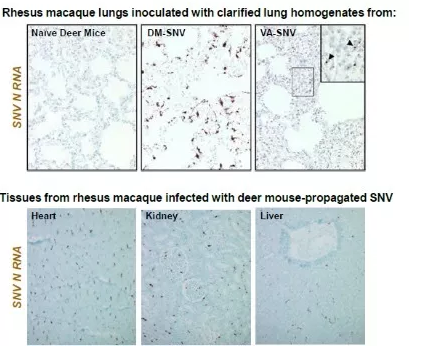 相同的 RNAscope 應用實例也被報道在漢他病毒(Sin Nombre/Hantavirus,SNV)感染病毒動物模型中。RNAscope 結果確認漢塔病毒存在于恒河猴肺臟上皮細胞內(下圖中棕色信號點)[5]。