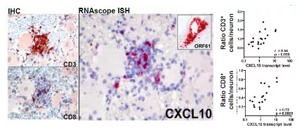RNAscope 檢測結果顯示感染過 SVV 之后,伴隨著 CD8 陽性 T 細胞的聚集,同一區域表達 CXCL10 細胞趨化因子,提示 T 細胞的聚集是由 CXCL10 因子誘導引發的[4]。