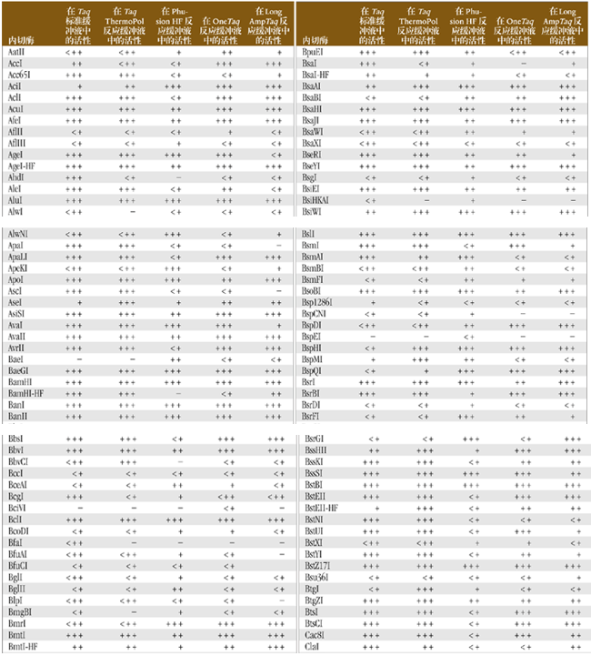 通常,PCR 反應后還要對產物進行酶切才能進行下一步工作。為了方便起見,可以將內切酶直接加到 PCR 反應產物中,而省略純化 PCR 產物的步驟。下表歸納了在 Taq、Phusion*、OneTaq 和 LongAmpTaq PCR 產物混合物中各種限制性內切酶的酶切活性。50 μl 反應體系中,將 5 單位內切酶加入到 PCR 反應產物中,在適當的溫度下反應 1 小時,凝膠電泳分析酶活性。PCR 反應產物中包括:1X ThermoPol 反應緩沖液、標準 Taq 反應緩沖液、Phusion HF 反應緩沖液、OneTaq 標準反應緩沖液或 LongAmpTaq 反應緩沖液,含 dNTPs(終濃度為 200 μM)、1 μg DNA 和 1 單位 Taq DNA 聚合酶。