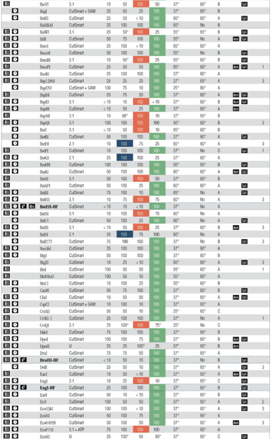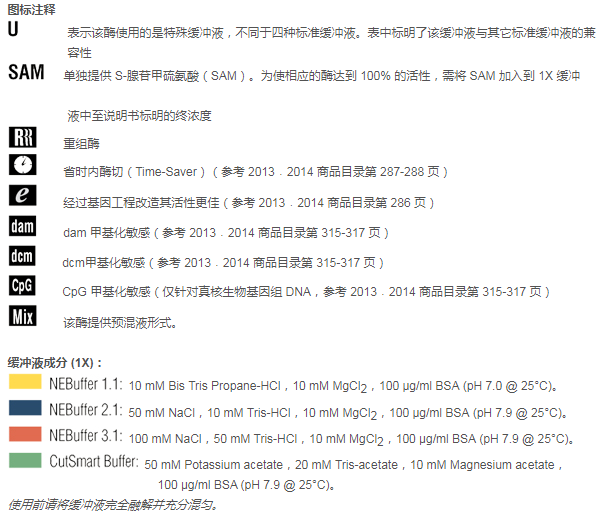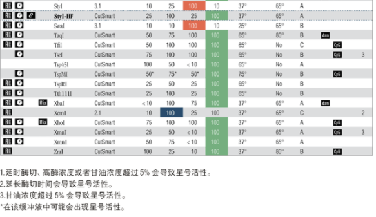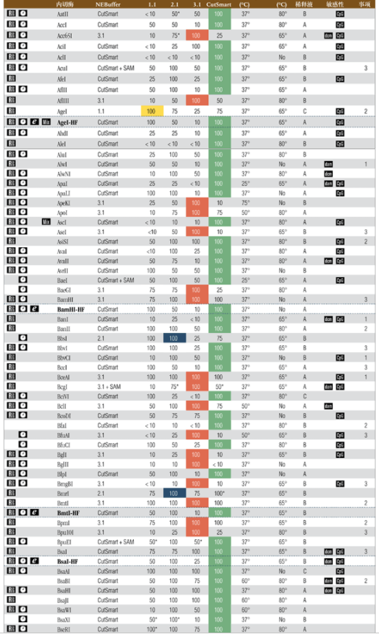 注:表中數值為近似值,所用底物與內切酶定義中的底物相同,更新的內容請查閱 www.neb-china.com 及