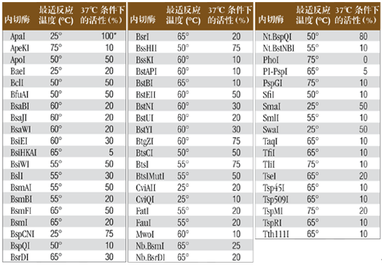 表中列出了限制性內切酶的最適反應溫度。對于最適反應溫度不是 37℃ 的限制性內切酶,請閱 2013﹒2014 商品目錄 284 頁查詢其在 37℃ 時的活性。