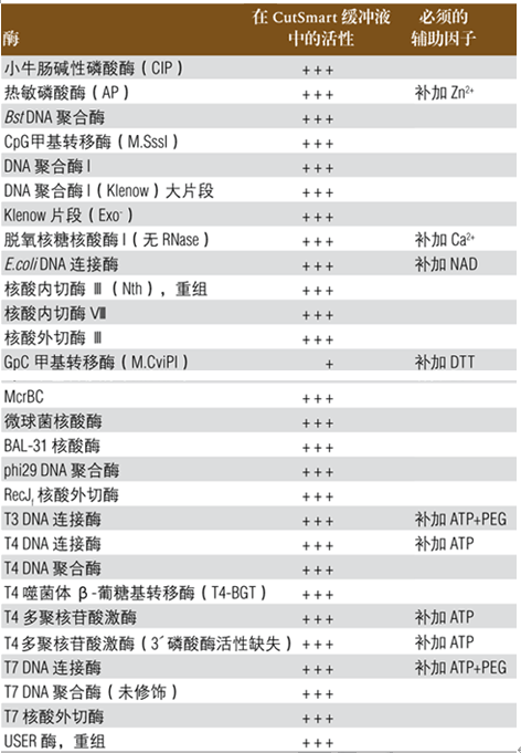 在常用的克隆酶中,選出了一系列 DNA 修飾酶,用 CutSmart 緩沖液代替隨酶提供的緩沖液,進行酶活檢測。比較酶在 CutSmart 緩沖液(添加必須的輔助因子)和隨酶提供的緩沖液中的活性。反應體系是根據修飾酶的推薦反應體系建立的,用 CutSmart 反應緩沖液替代隨酶提供的反應緩沖液。結果比較如下表中所示。