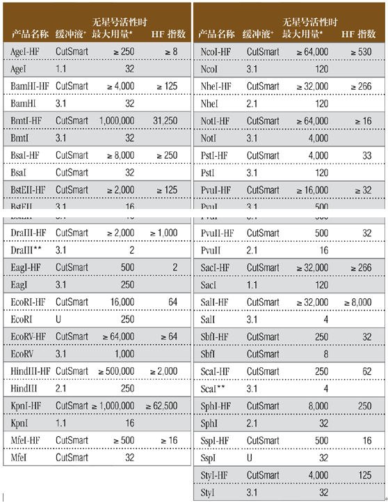 下表為 HF 內切酶和其野生型在檢測到明顯星號活性前的最大酶用量。HF 指數代表在選擇 HF 內切酶時酶用量增加的倍數,數據清楚顯示了 HF 內切酶帶來的靈活性。