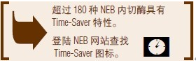 無論您是在進行大量克隆的快速篩選還是進行過夜酶切,NEB 高品質的酶都會給您帶來更大的便利。通常,進行限制性酶切時都需要在 50 μl 反應總體系中,加入 1 μl 酶反應 1 小時來消化 1 μg 純化的 DNA。但是,若選用 NEB Time-Saver 特性的酶,可以大大加速您的篩選進程。這些酶在建議反應條件下,加入 1 μl 就可以在5-15 分鐘內消化 1 μg DNA。且這些酶在產品規格、濃度上沒有任何改變,也不需要重新購買更貴的新產品來實現 5-15 分鐘快速酶切,這與其他供應商的產品完全不同。溫育時間過長你也不必擔心。