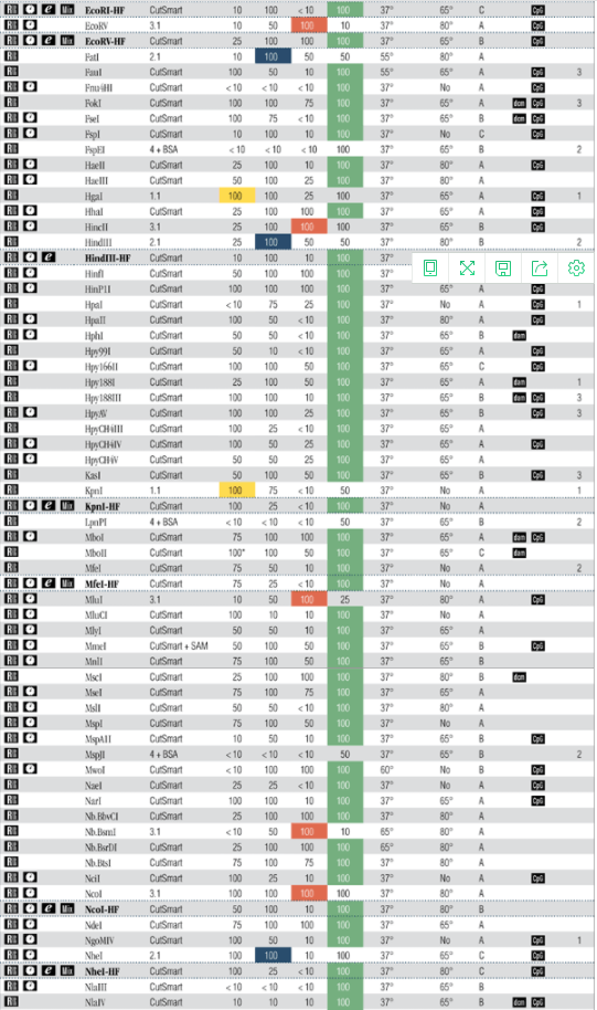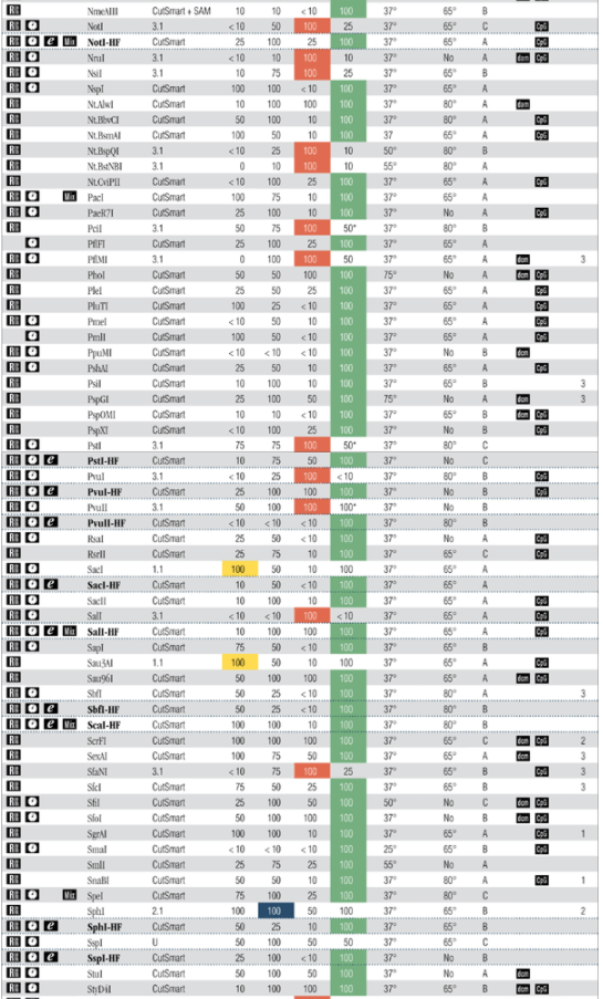 該表總結了 NEB 所有限制性內切酶的活性信息。為了幫助您選擇雙酶切的最佳條件,該表列出了酶的最佳活性 NEBuffer(隨酶提供)和每種內切酶在四個標準緩沖液中的活性。需要注意的是 BSA 現在已經添加到緩沖液中,不再單獨提供。雙酶切反應體系請參考 2013﹒2014 商品目錄第 276 頁。此外,活性表中列出了反應溫度、熱失活溫度、推薦稀釋液、甲基化敏感性和該酶是否有省時酶特性(即在建議的反應條件下,5-15 分鐘可完全切割底物,過夜酶切也不會降解 DNA)。